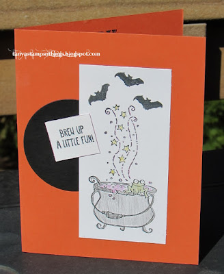 I don't use a lot of Halloween things, in fact, this is my mom's latest order. But I did think it would be fun to have a Halloween-y note for the kids' lunch boxes, so that is what these are! I used exactly the same supplies for these cards, just changed the card stock color, and the ink I sponged over the masks. That made these quick cards as well!